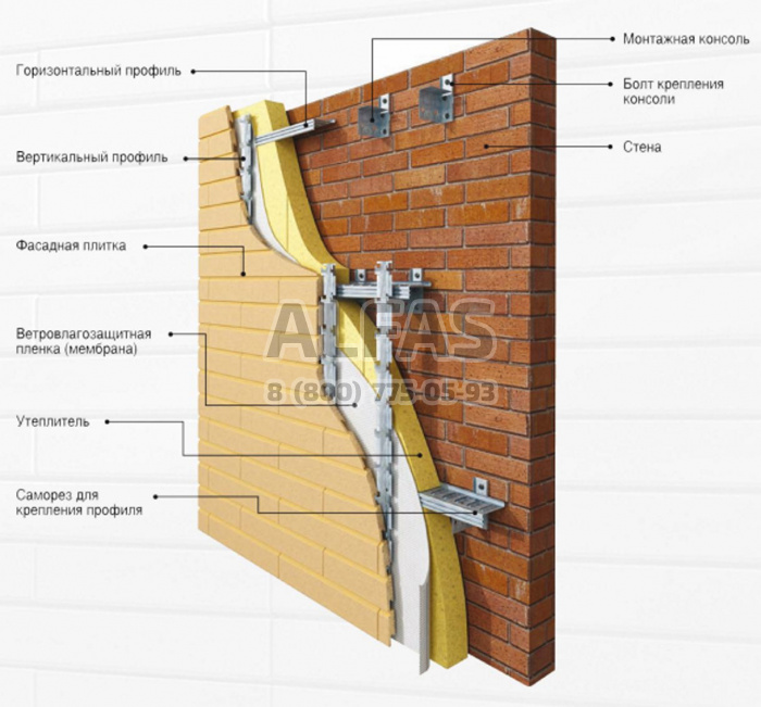 Элементы навесной вентилируемой системы: - паронитовая прокладка; - кронштейн; - горизонтальный профиль; - вертикальный профиль; Дополнительные элементы: - стальные профили для обрамления оконных и дверных проемов; - подоконники, оконные сливы; - крепежные элементы (анкера, саморезы, заклепки)